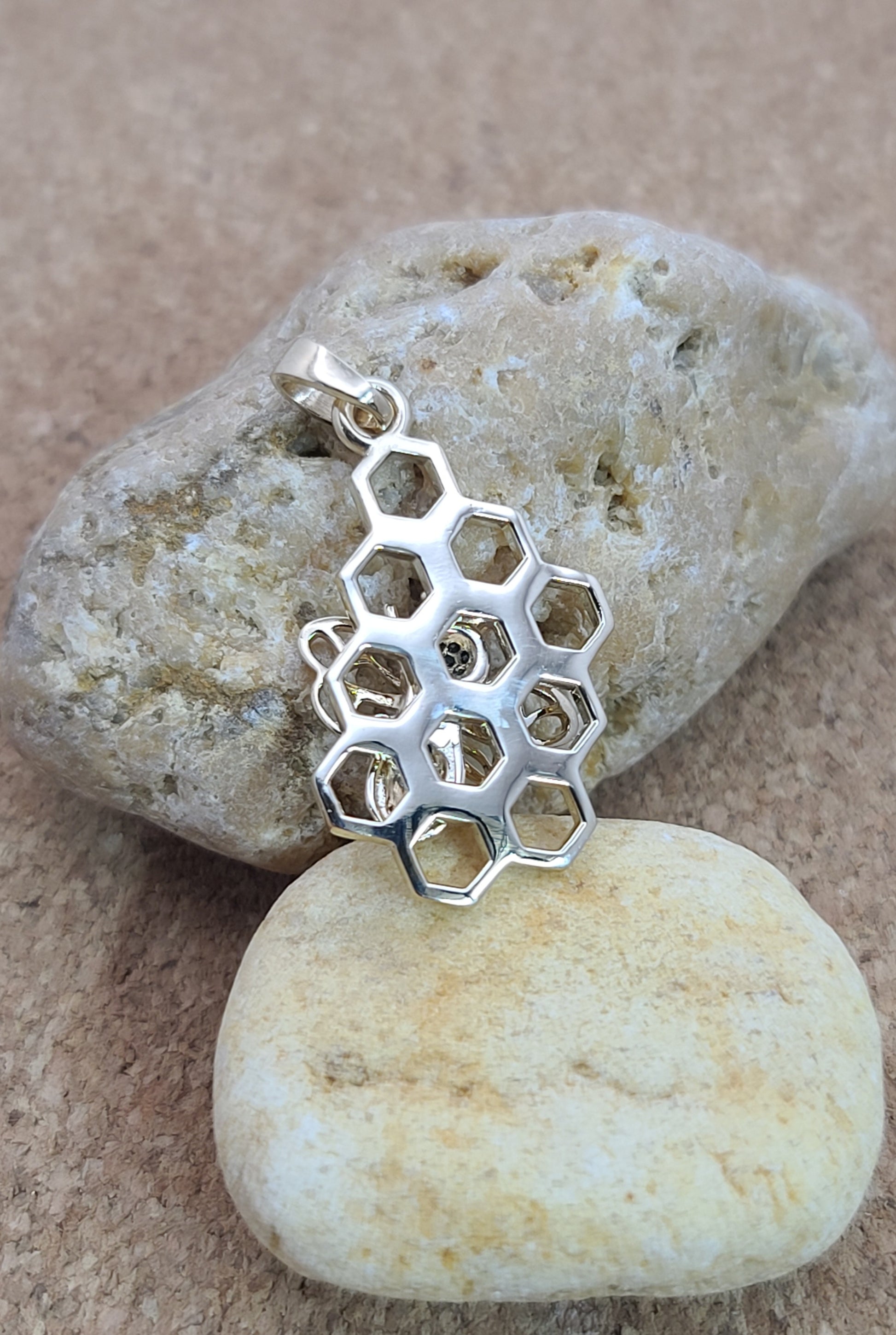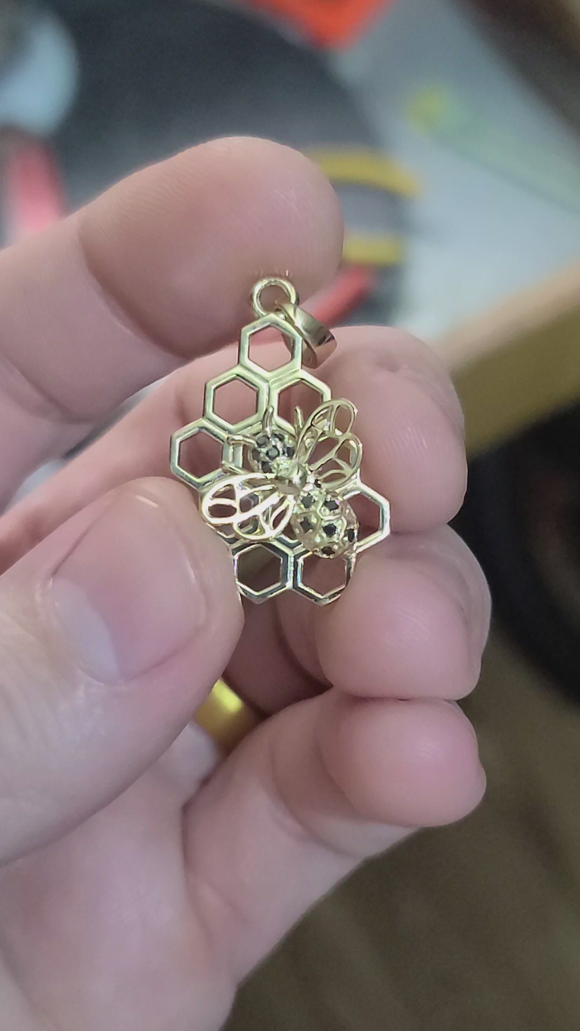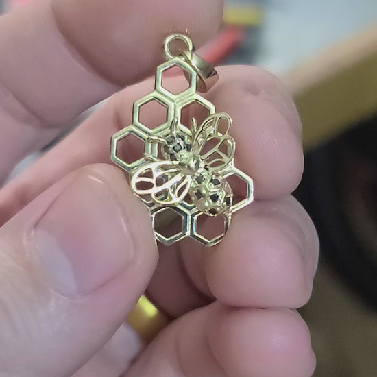 Solid gold honeybee set with mesmerizing black diamonds and mounted on a solid gold comb. This piece is not just jewelry; it's a work of art. Inspired by nature's elegance and crafted with unparalleled precision. This addition to our Honeybee collection is one of our favorites! We recommend at least our small chain for this pendant.