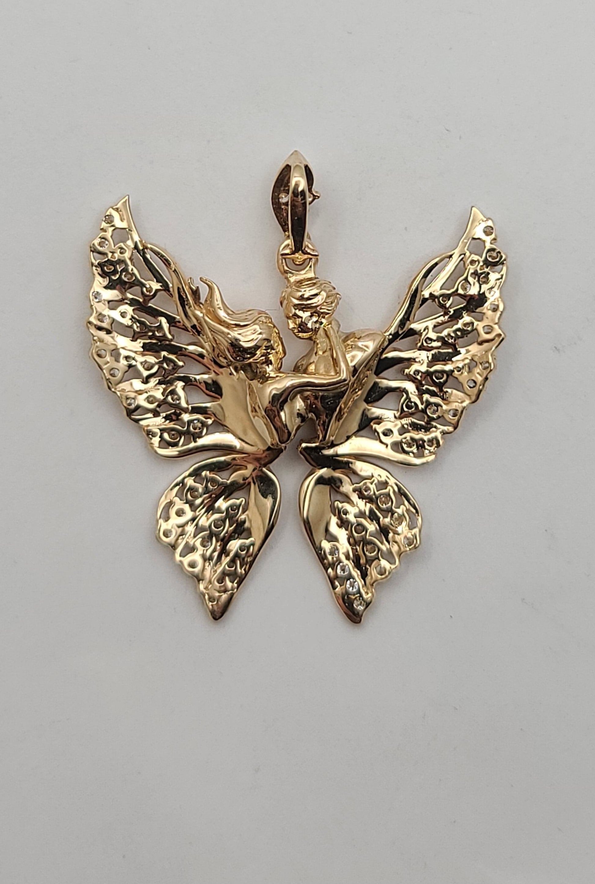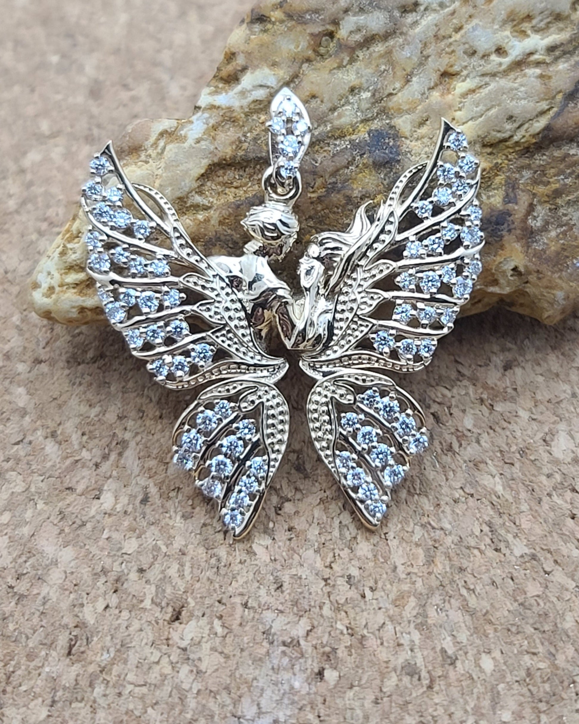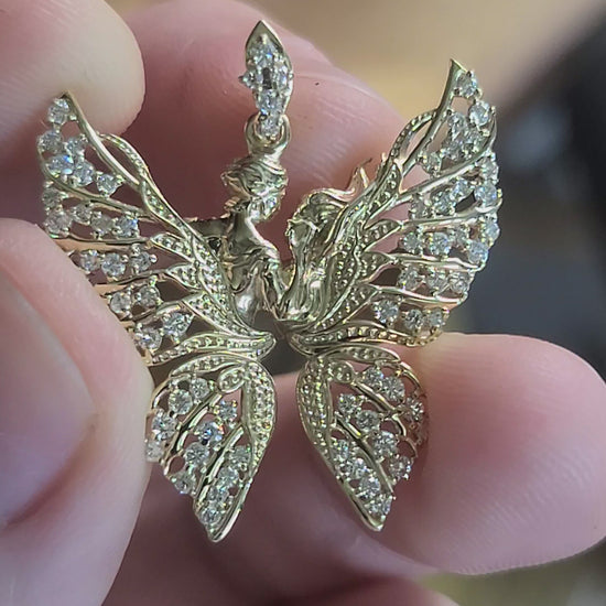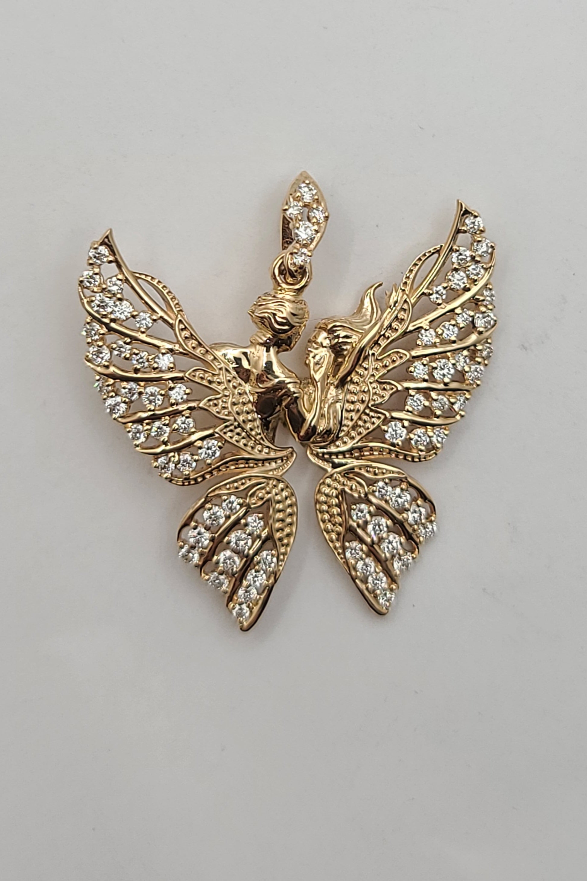 Wings that sparkle, hearts that beat as one. This handcrafted pendant captures the essence of connection and romance. In solid 14kt with natural diamonds, this is a testament to the art of love. We recommend at least our small chain for this pendant.