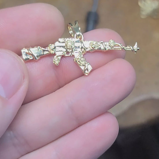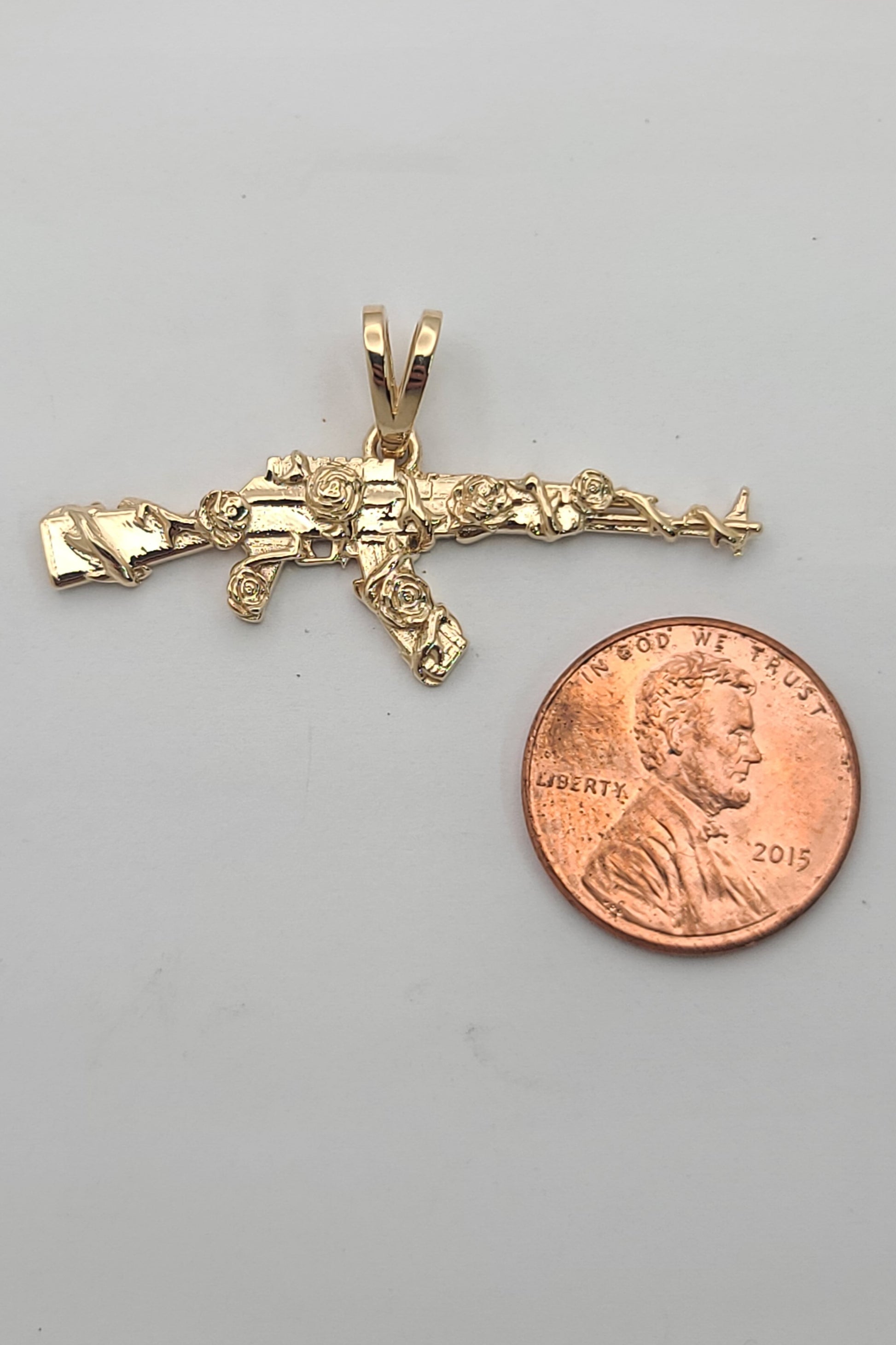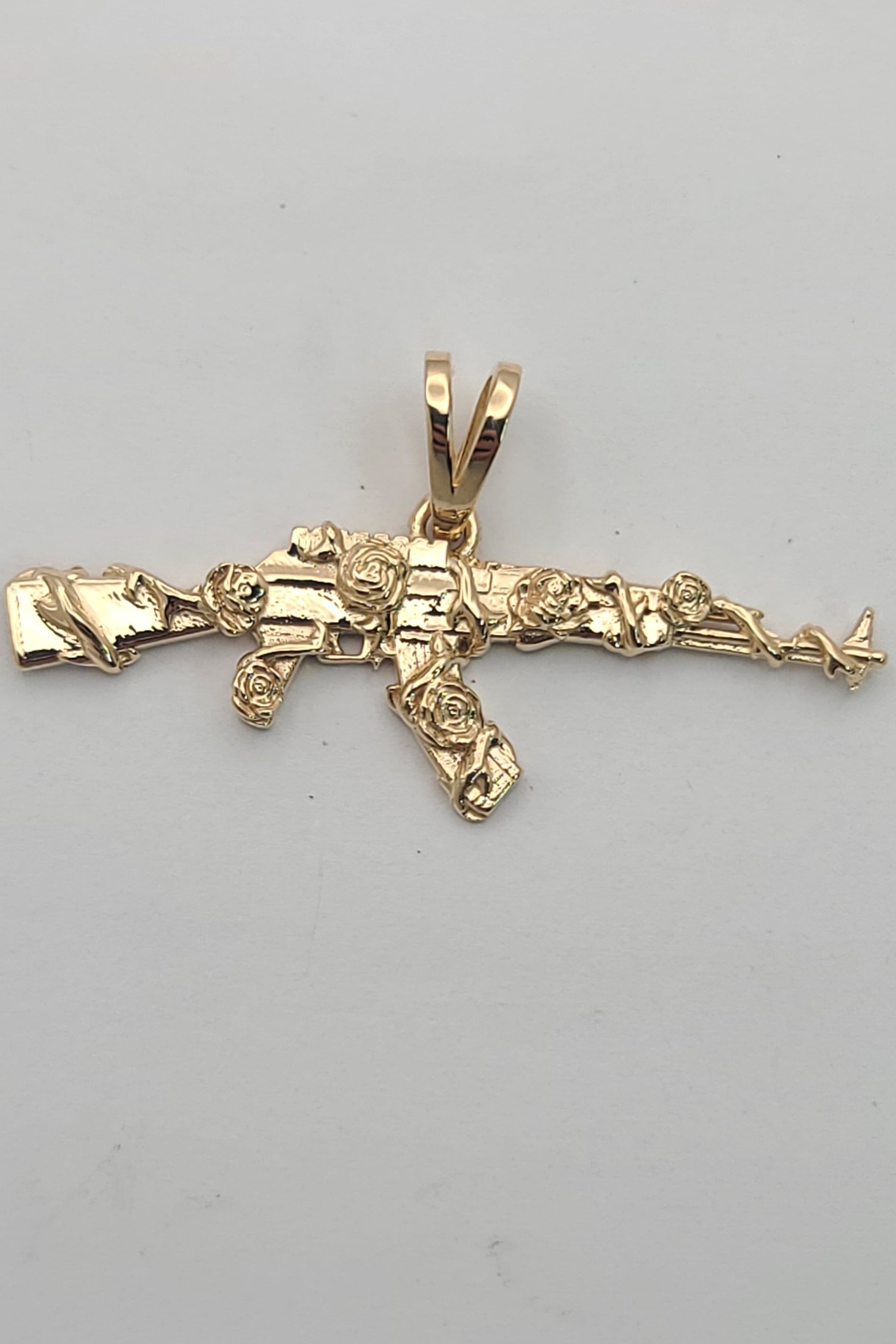 Solid 14kt gold and wrapped in vines and roses, this pendant is pleasantly detailed and has a smooth back. Made in your choice of color, this pendant makes an awesome present for that someone with everything. We recommend at least our small chain for this pendant.