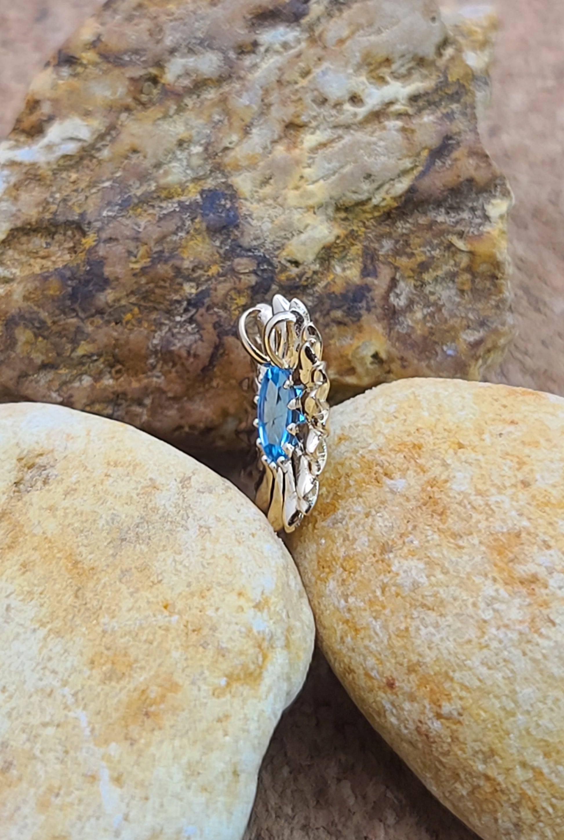 Set in solid 14kt gold, with a gorgeous rose cut, natural blue topaz, these pendants are sure to show off her summer radiance, well into winter. We recommend our small chains or heavier for this pendant. Contact us to have it mounted in the center of a dedicated chain! (must purchase chain in same order, no need to contact us before order, simply place order and contact us immediately afterwards)