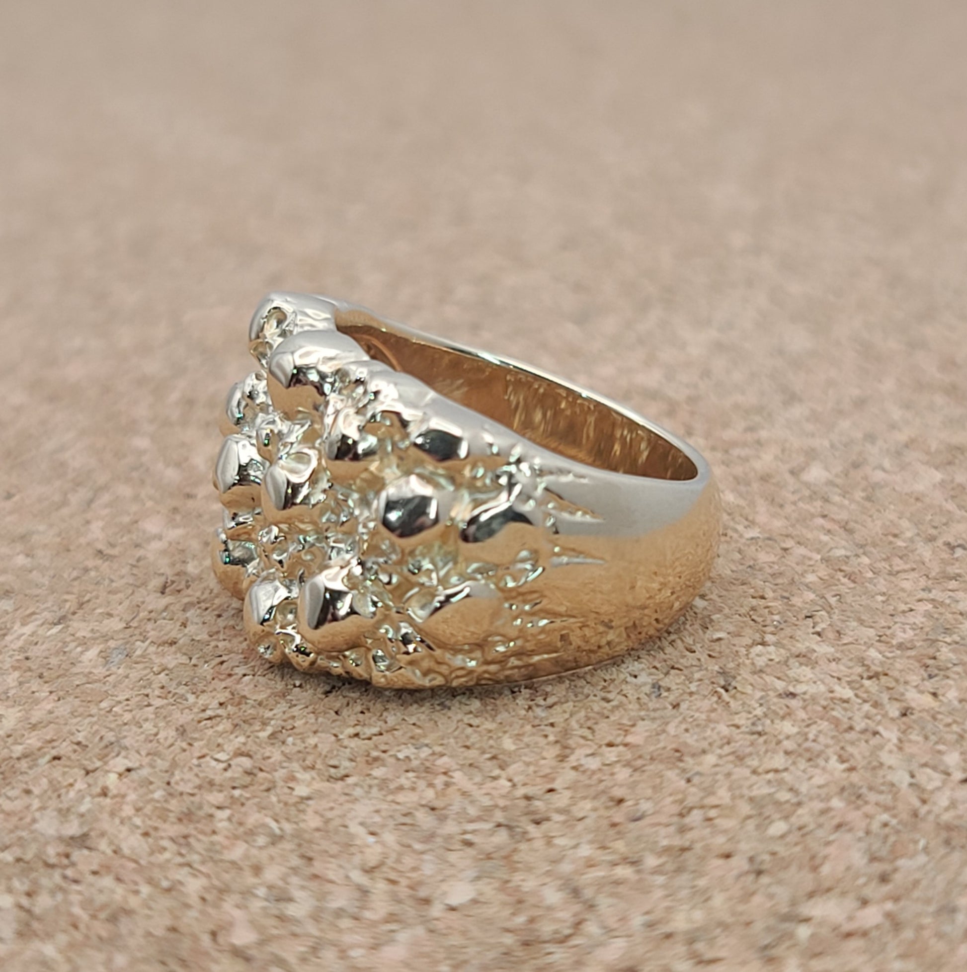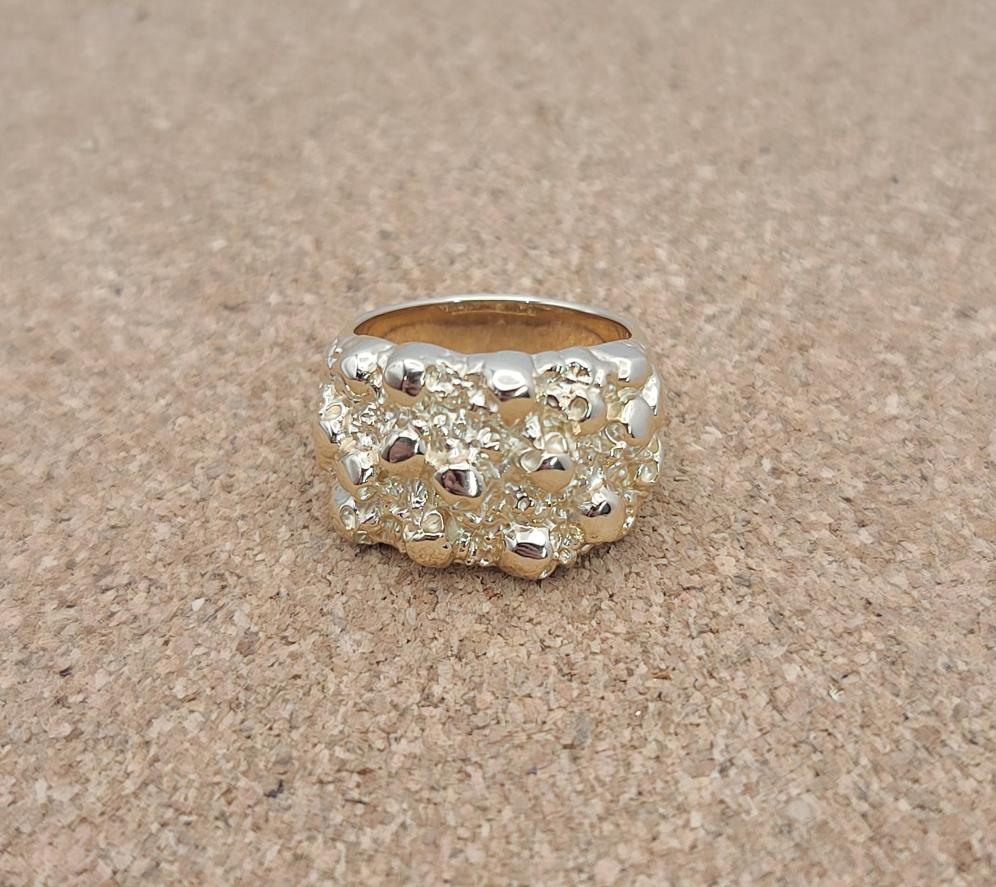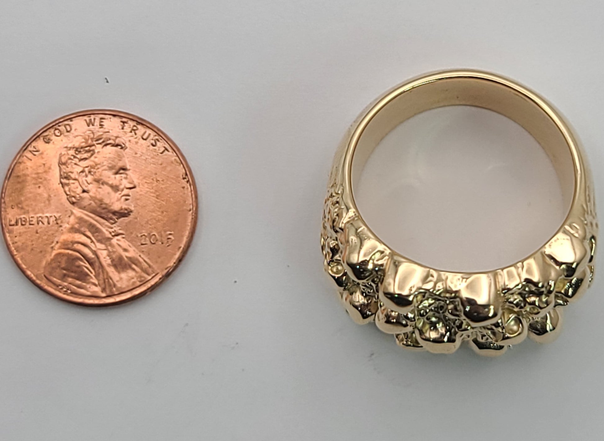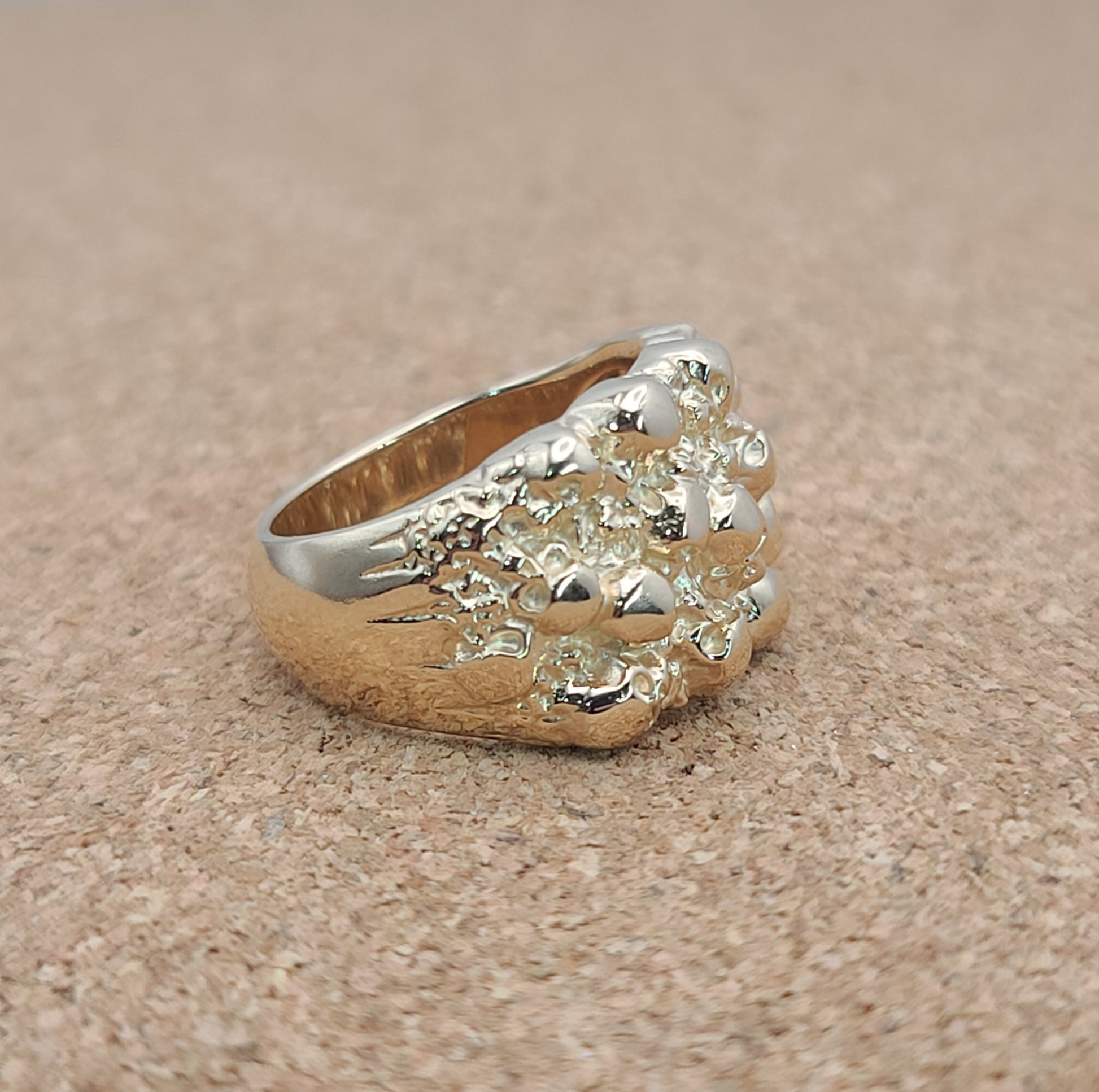 With many small skulls nestled at odd angles, this is a truly unique work of art, as well as a solid chunk of 14kt gold in your color choice. From a distance it looks like a big nugget ring but the closer you look, the more you see! And yes, it is made in-house, smooth, solid, and comfortable.