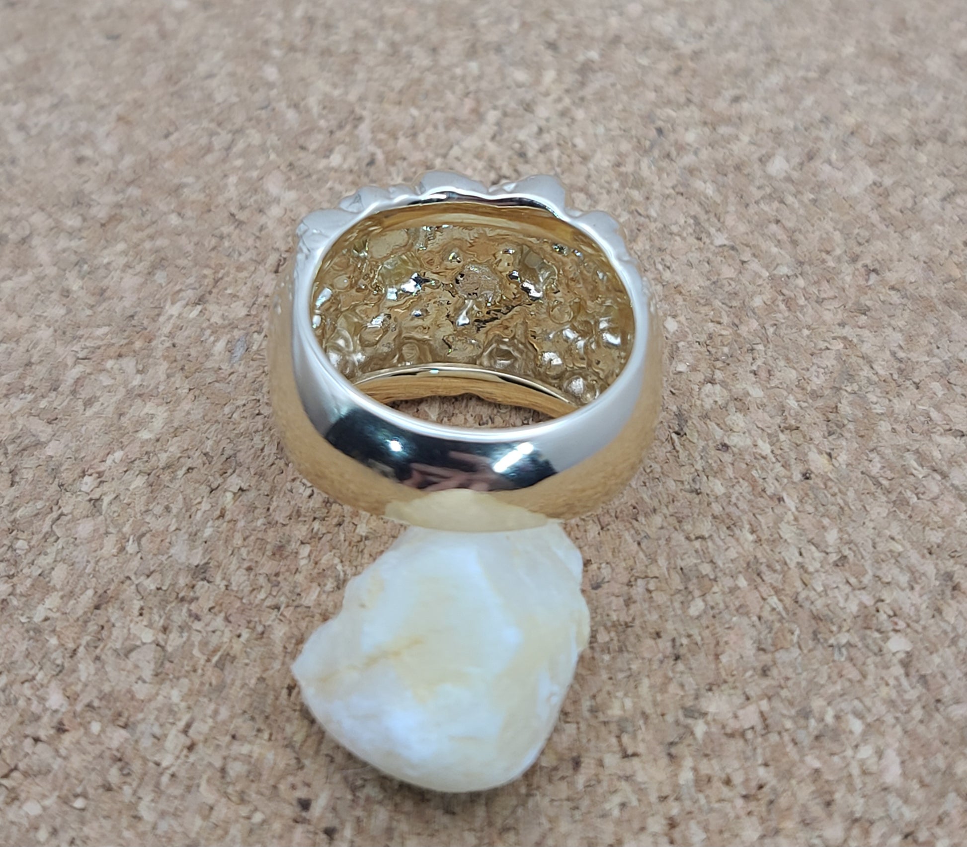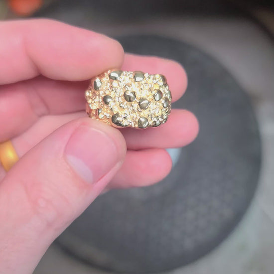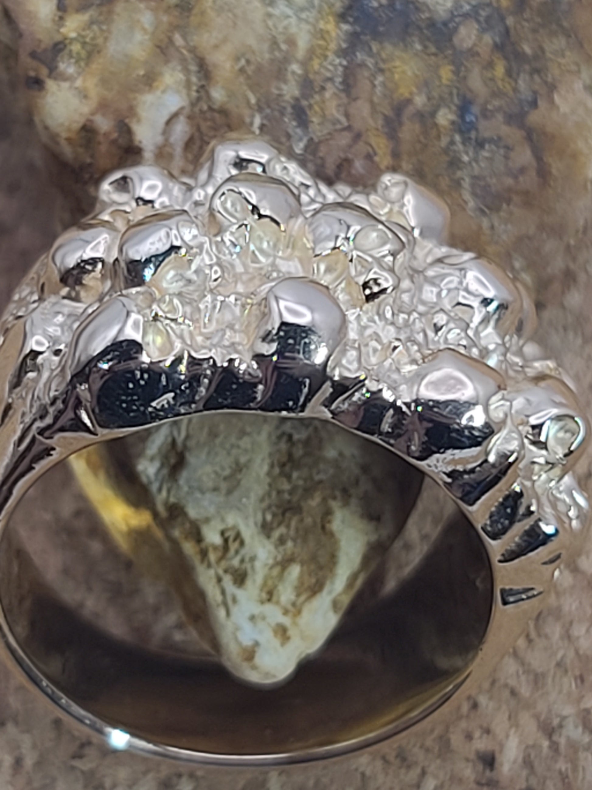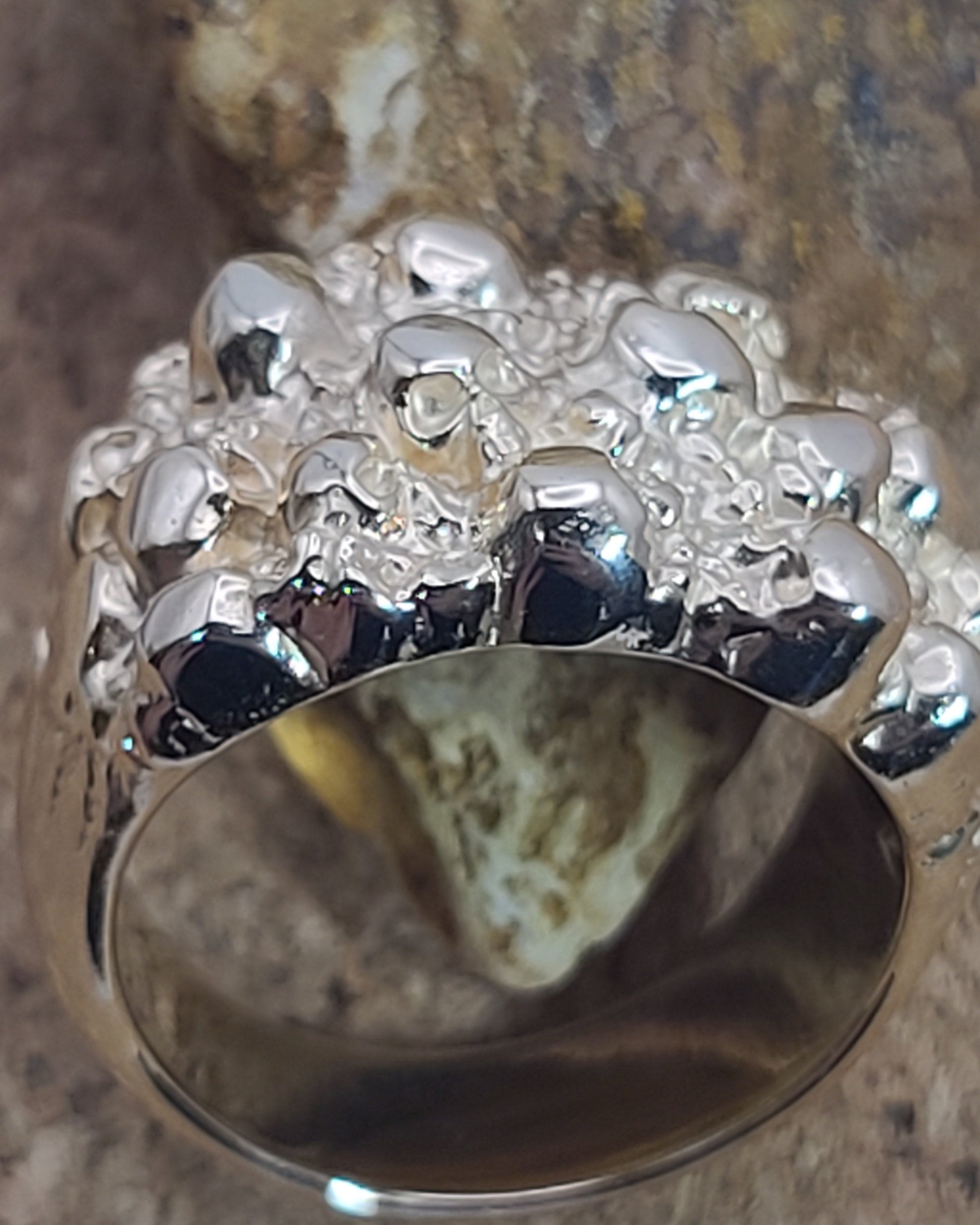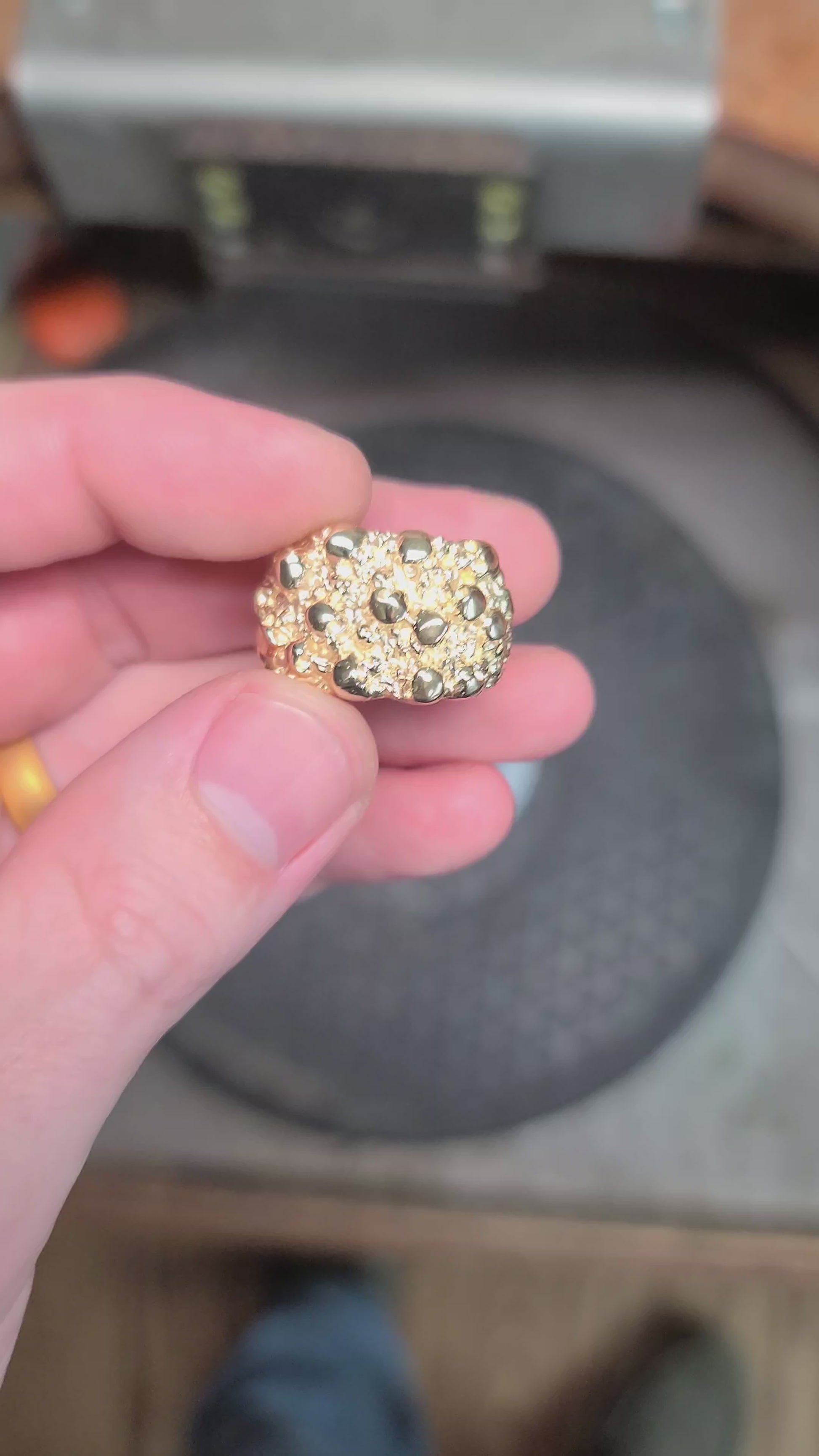 With many small skulls nestled at odd angles, this is a truly unique work of art, as well as a solid chunk of 14kt gold in your color choice. From a distance it looks like a big nugget ring but the closer you look, the more you see! And yes, it is made in-house, smooth, solid, and comfortable.