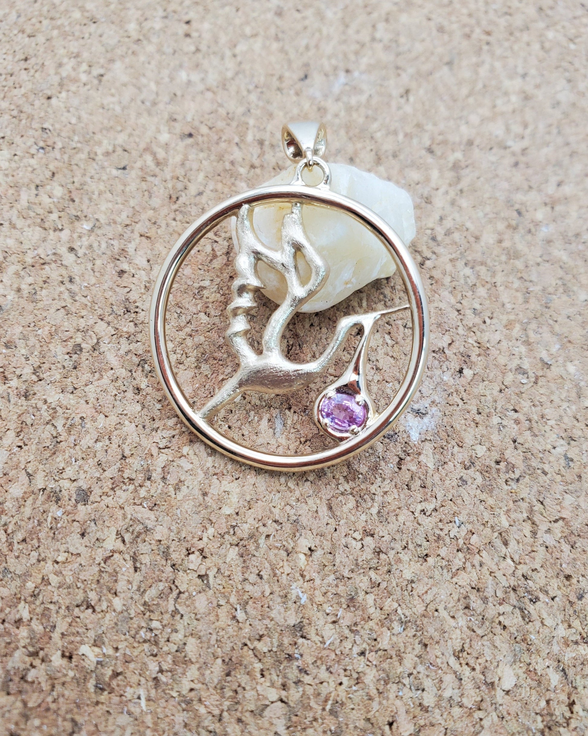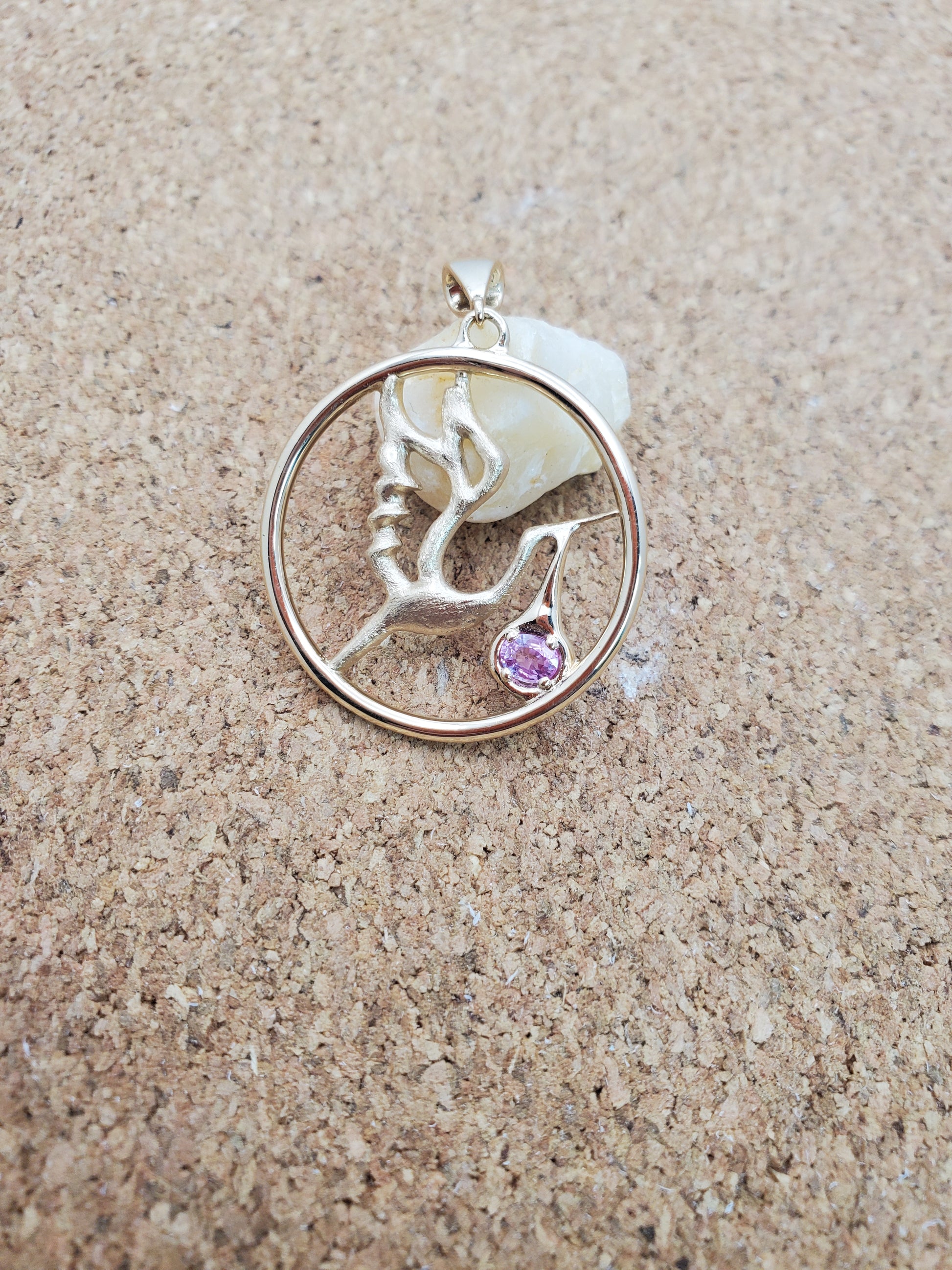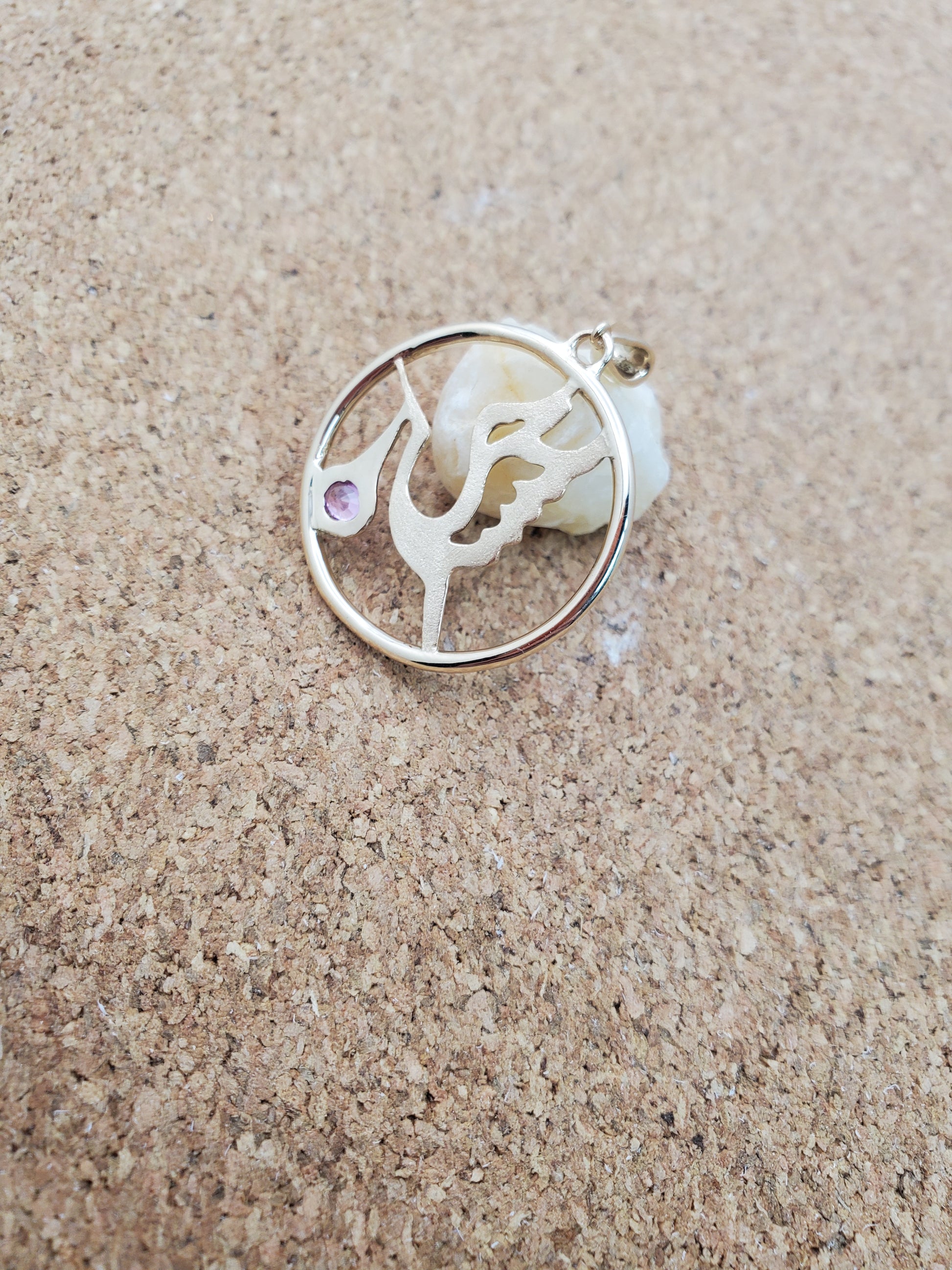 Beautiful, solid, 14kt gold stork pendant with a natural pink sapphire in the baby basket! The stork has a neat texture giving it a unique touch.