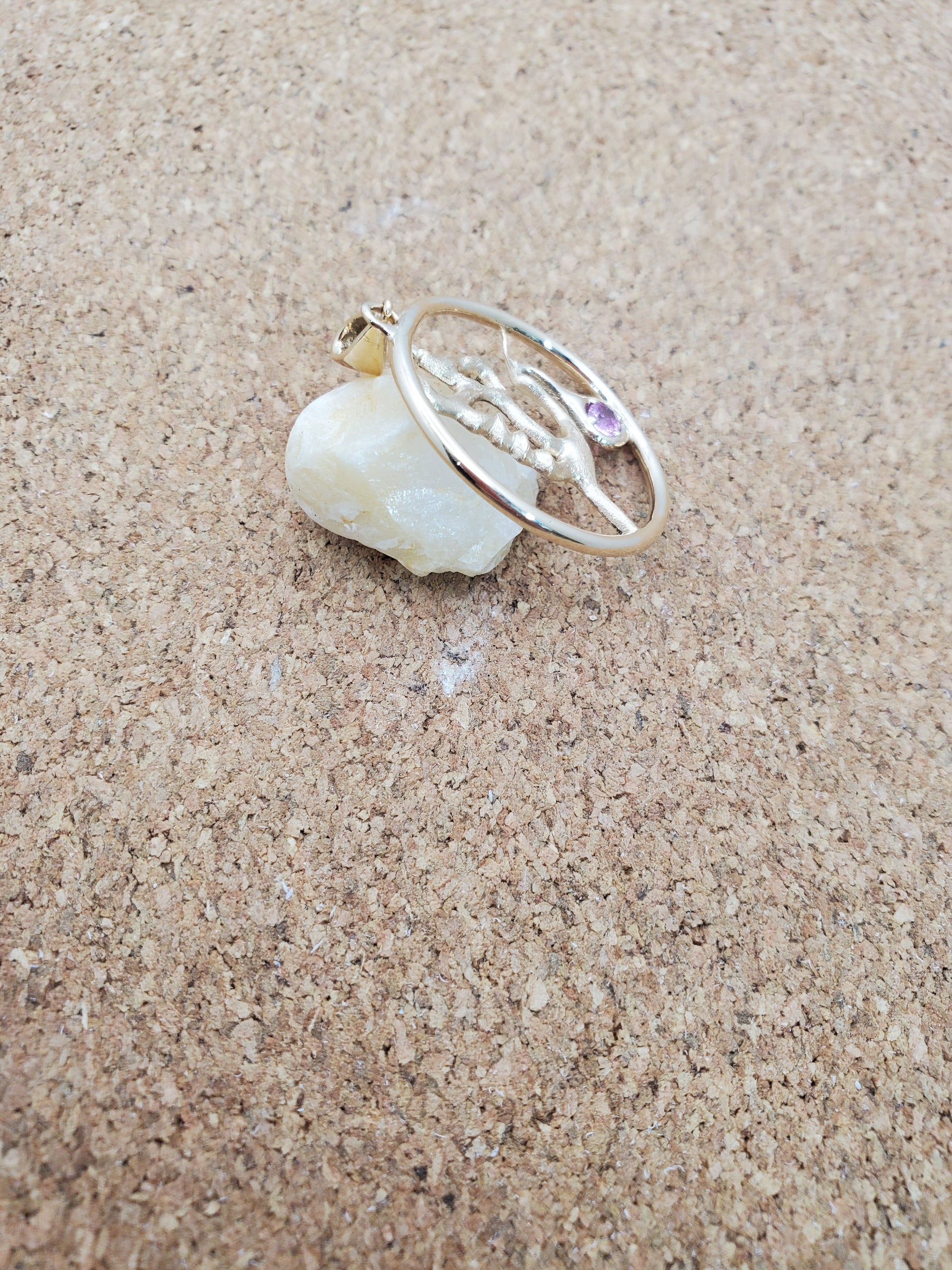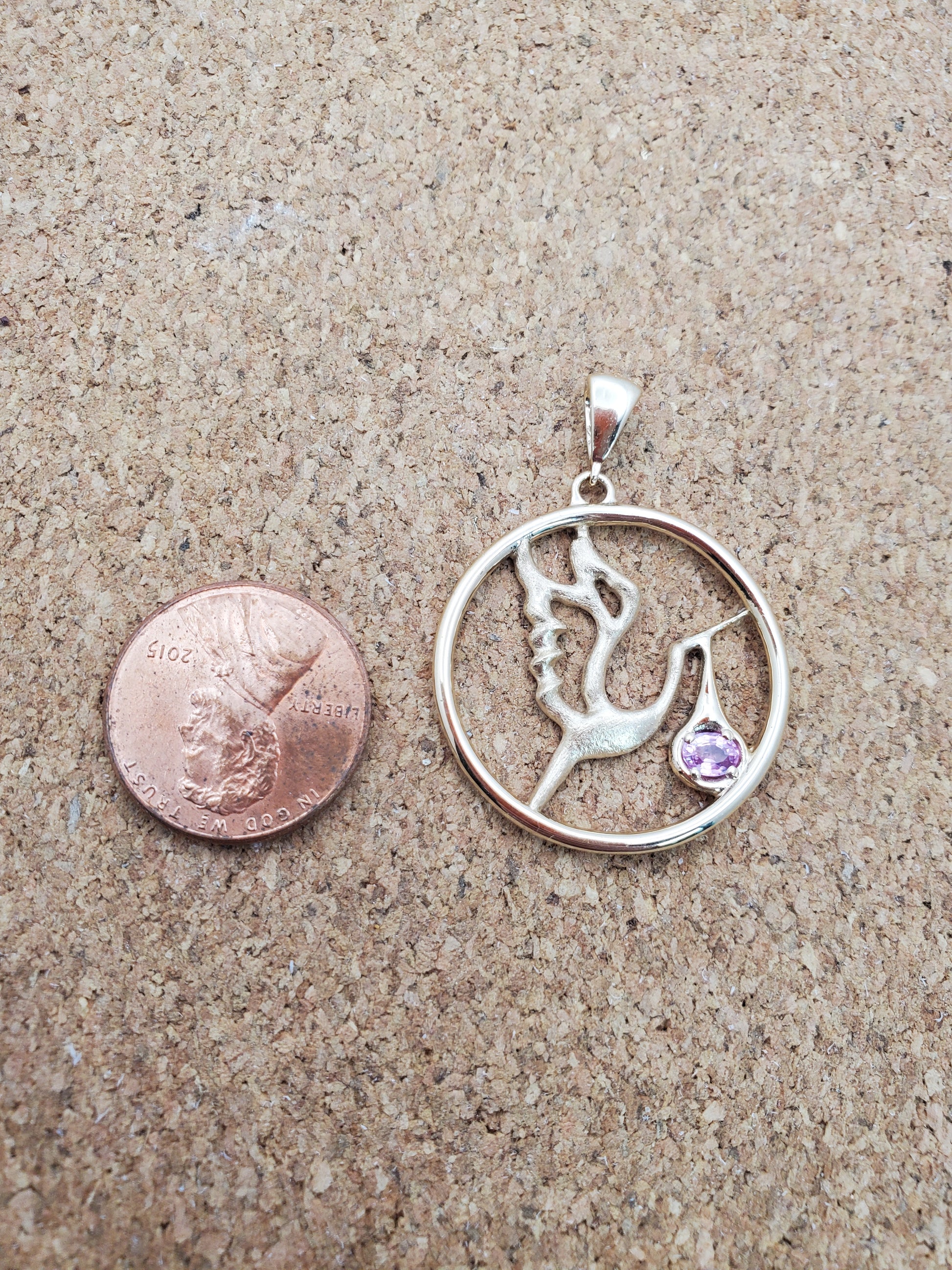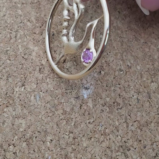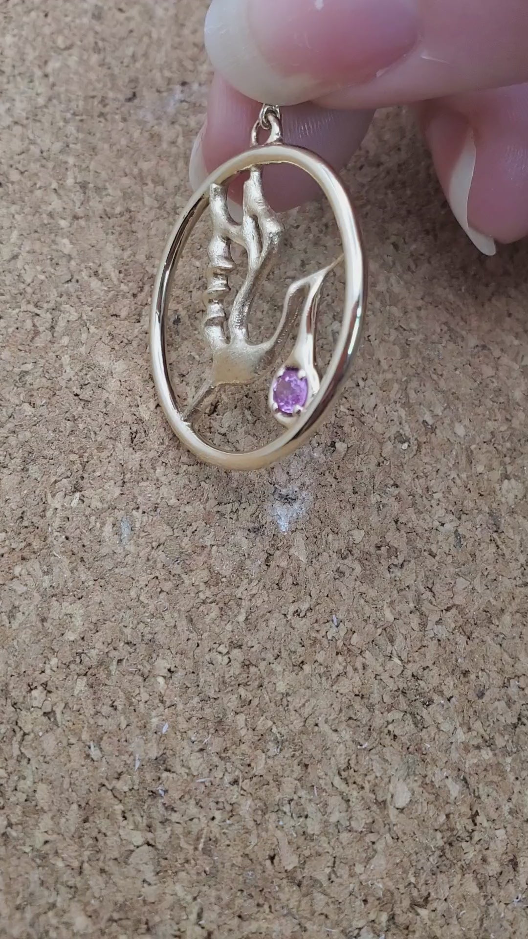 Beautiful, solid, 14kt gold stork pendant with a natural pink sapphire in the baby basket! The stork has a neat texture giving it a unique touch.